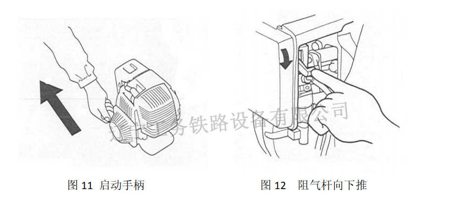 在輕輕拉啟動手柄,直到感到有阻力時再用力拉,如汽油機長時間未使用,應(yīng)連續(xù)拉動啟動手柄幾次使汽油進入油路系統(tǒng),汽油機即可發(fā)動(見圖 11);