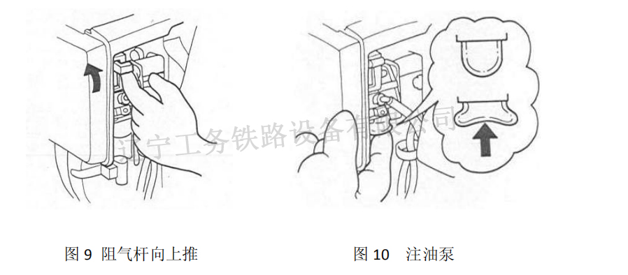 首先將汽油機的啟動開關(guān)撥至“ON”位置(處于汽油機右側(cè));然后把阻氣桿移至關(guān)閉位置(見圖 9),氣門處于關(guān)閉位置,按注油泵數(shù)次直到汽油回管中可以明顯地看到油流時為止(見圖 10)