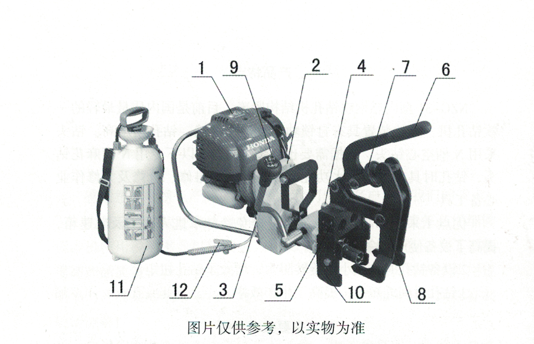 1. 汽油機、2.齒輪箱、3.進水嘴、4標(biāo)尺定位器、5.定位尺、6.夾緊搖臂、7.調(diào)整螺母、8.夾具體、9.進給扳把、10.定位塊、11.注水桶、12.水閥